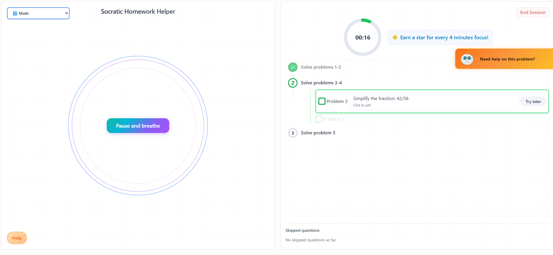 Through short, voice-based sessions, Socratic acts like a calm tutor. It explains problems in different ways, gives timely hints, and helps kids pause, breathe, and try again: reducing frustration and encouraging persistence.